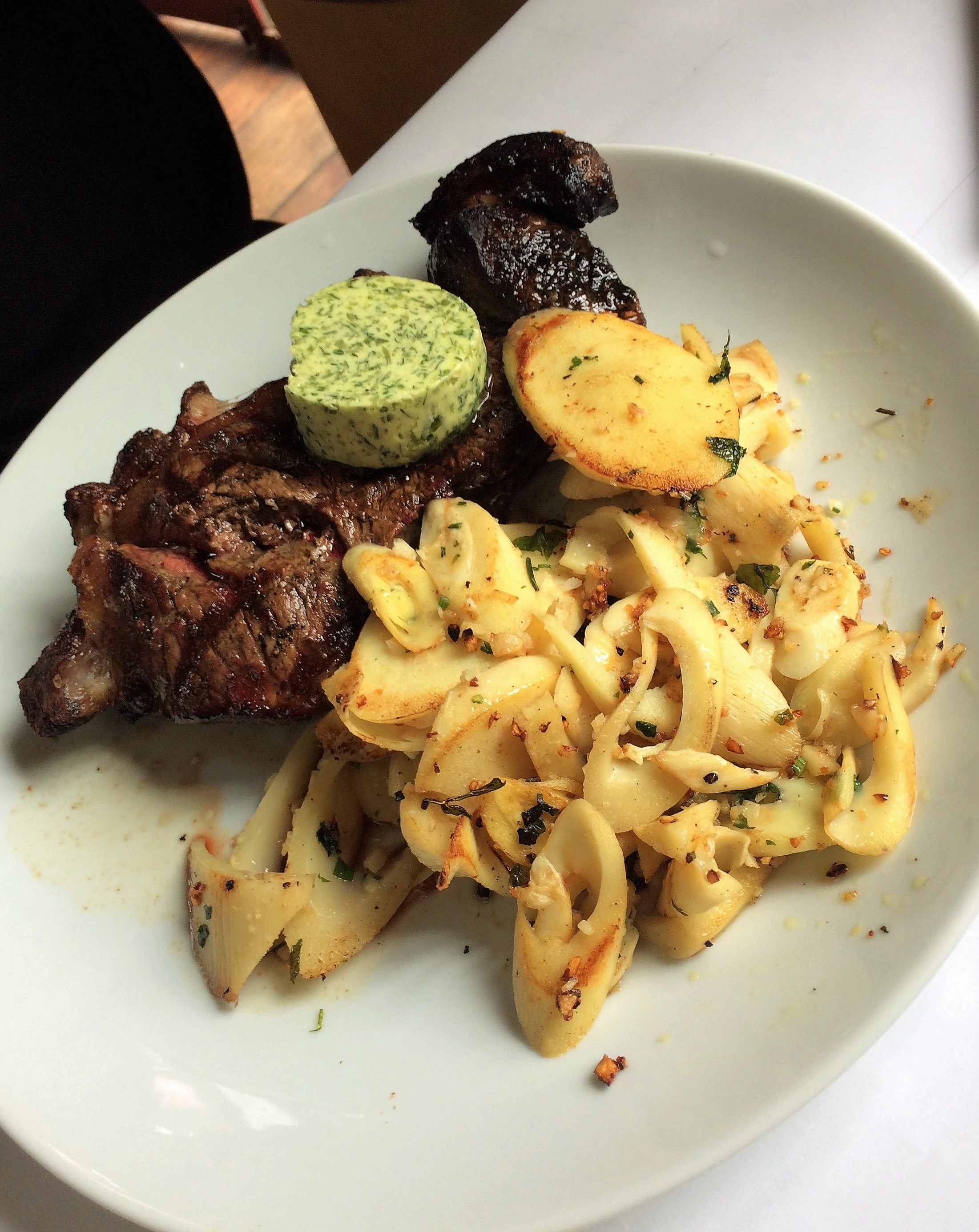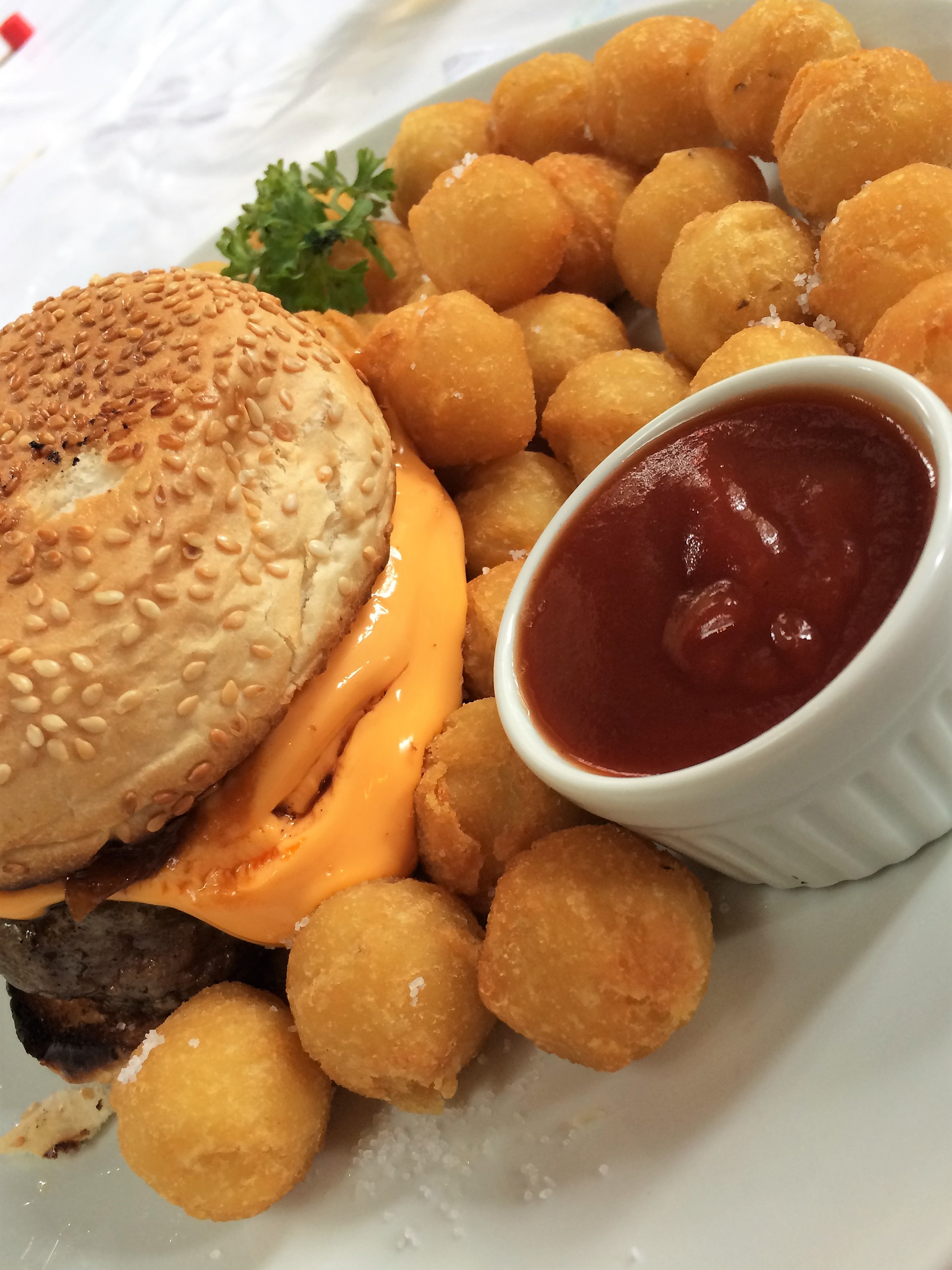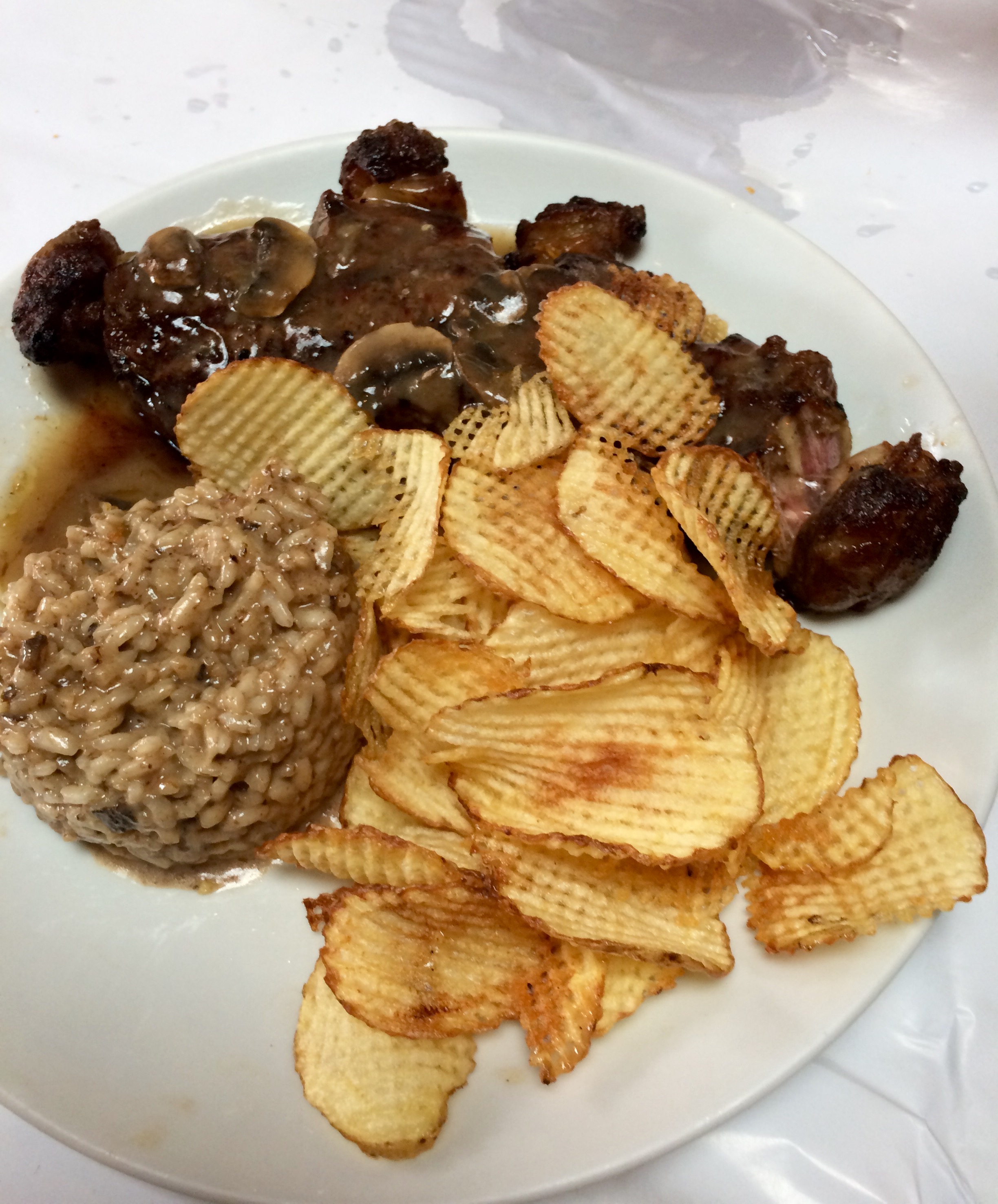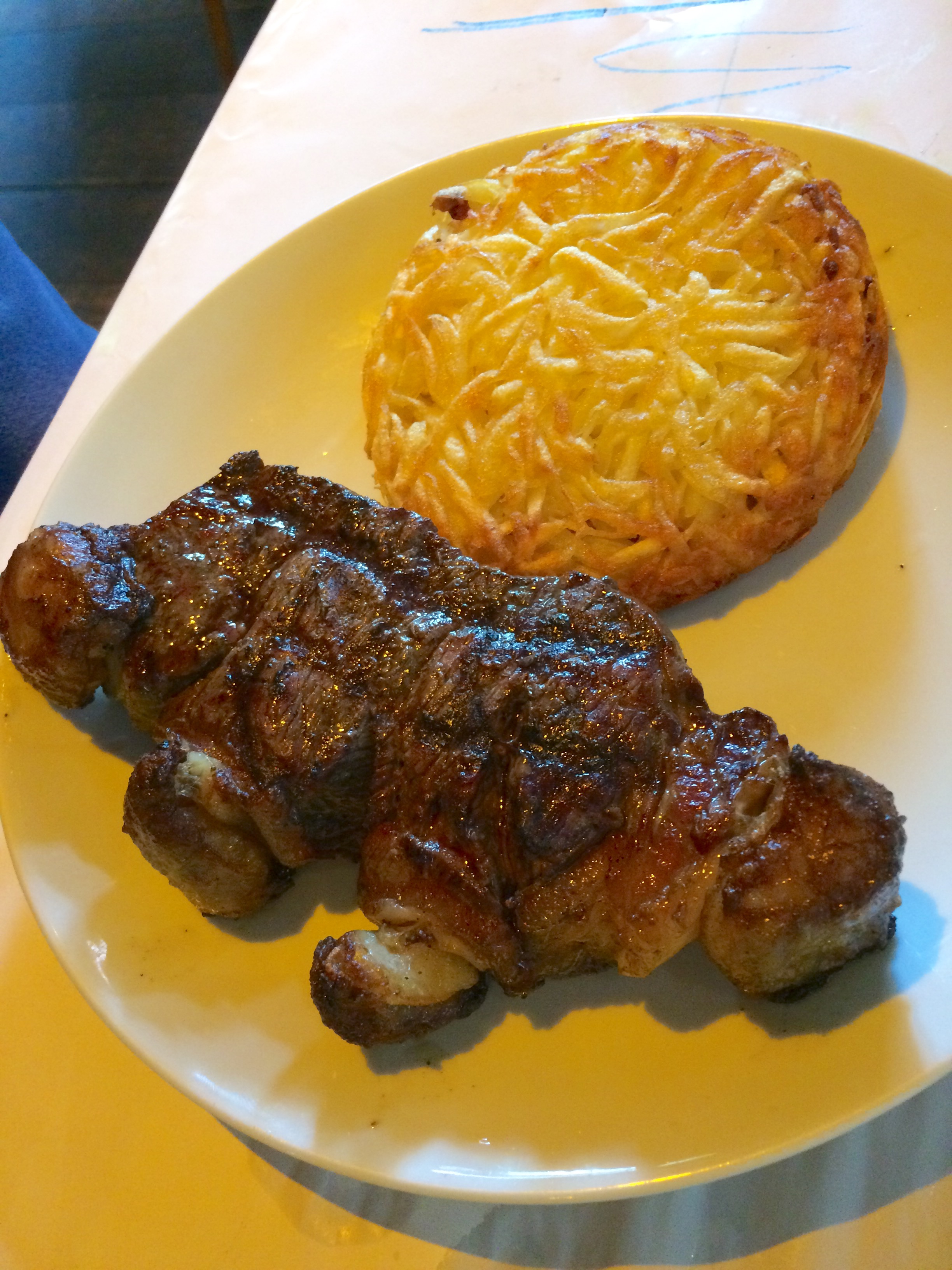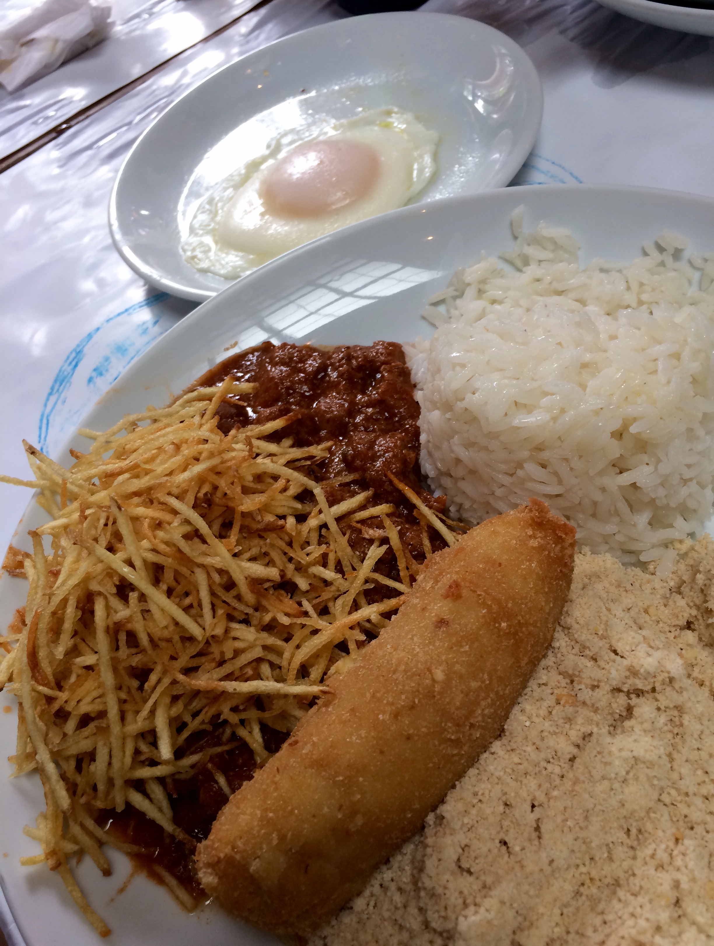 Como pratos principais, meus “acompanhantes secretos” provaram os bifes de chouriço arrematados por palmitos, batatas rosti, noisettes ou palito, risoto de fungui… Há diversas possibilidades. E não se arrependeram. Outra “acompanhante secreta” optou pelo nhoque de barôa com molho Alfredo e aspargos frescos, que não fez feio, assim como o belo hambúrguer e o tradicional picadinho de carne, acompanhado de banana, farofinha, batata palha, arroz branco e ovo frito.