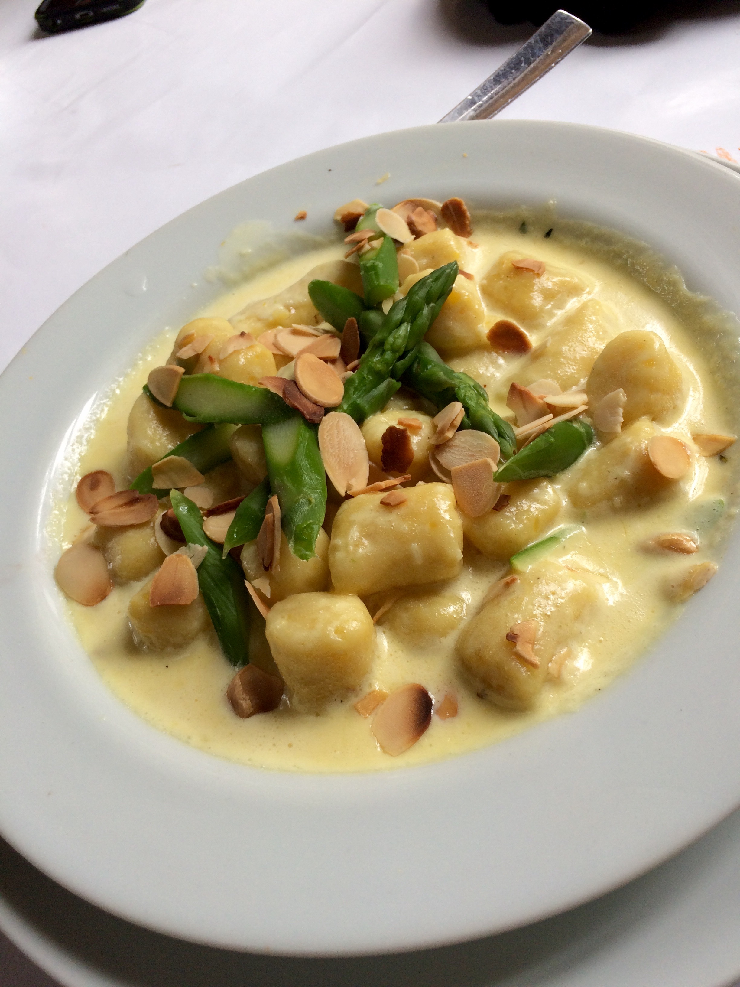 - O Nhoque de barôa com molho Alfredo e aspargos frescos