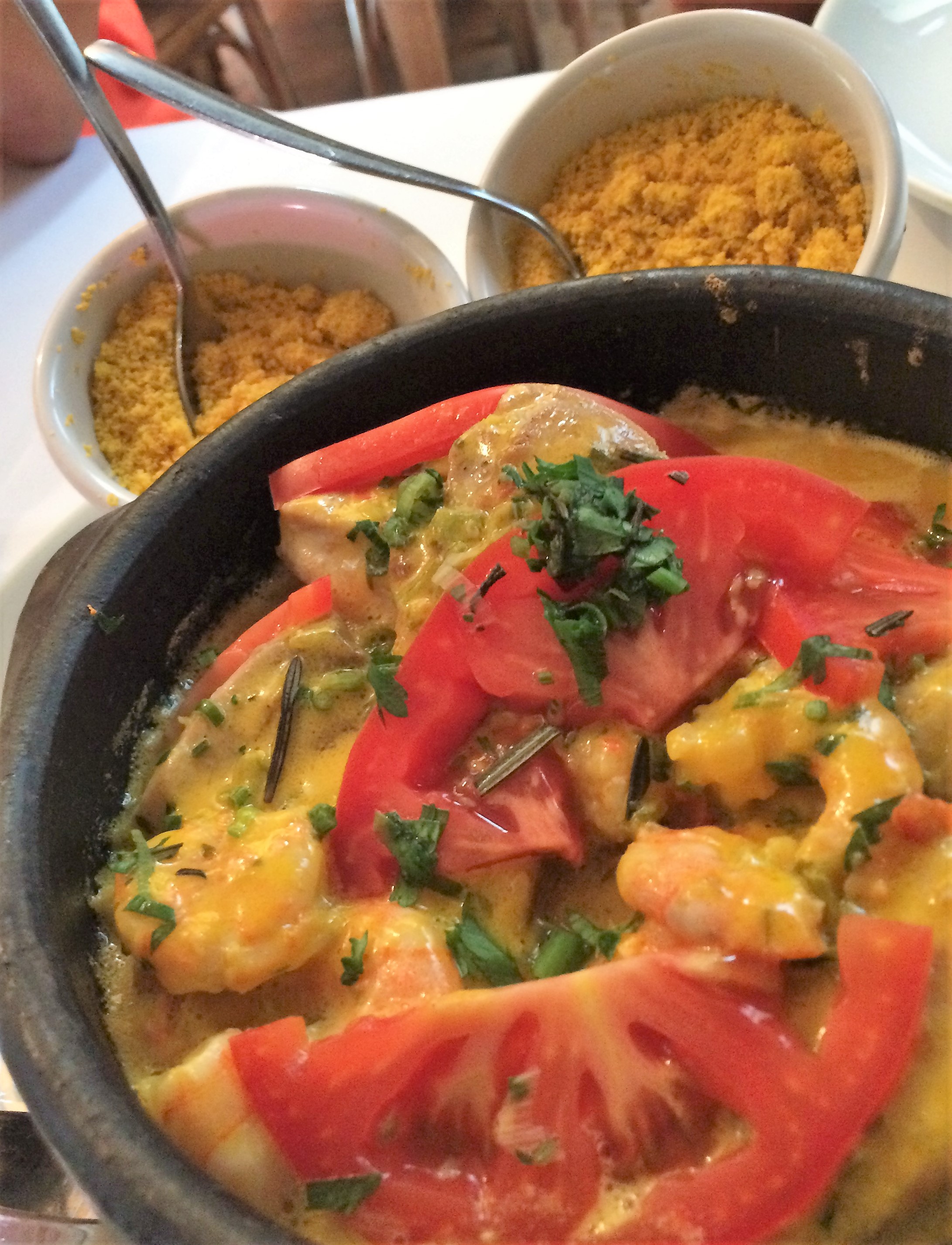 Mas a rainha do almoço foi, sem dúvida, a moqueca de dourado – branquinho e macio – com camarões. Vem borbulhando e cheirando bem demais, acompanhada de arroz branco e uma farofinha de dendê irretocável! E acredite: depois de algumas bolinhas de queijo, uma moqueca serviu bem três mulheres. Delícia!