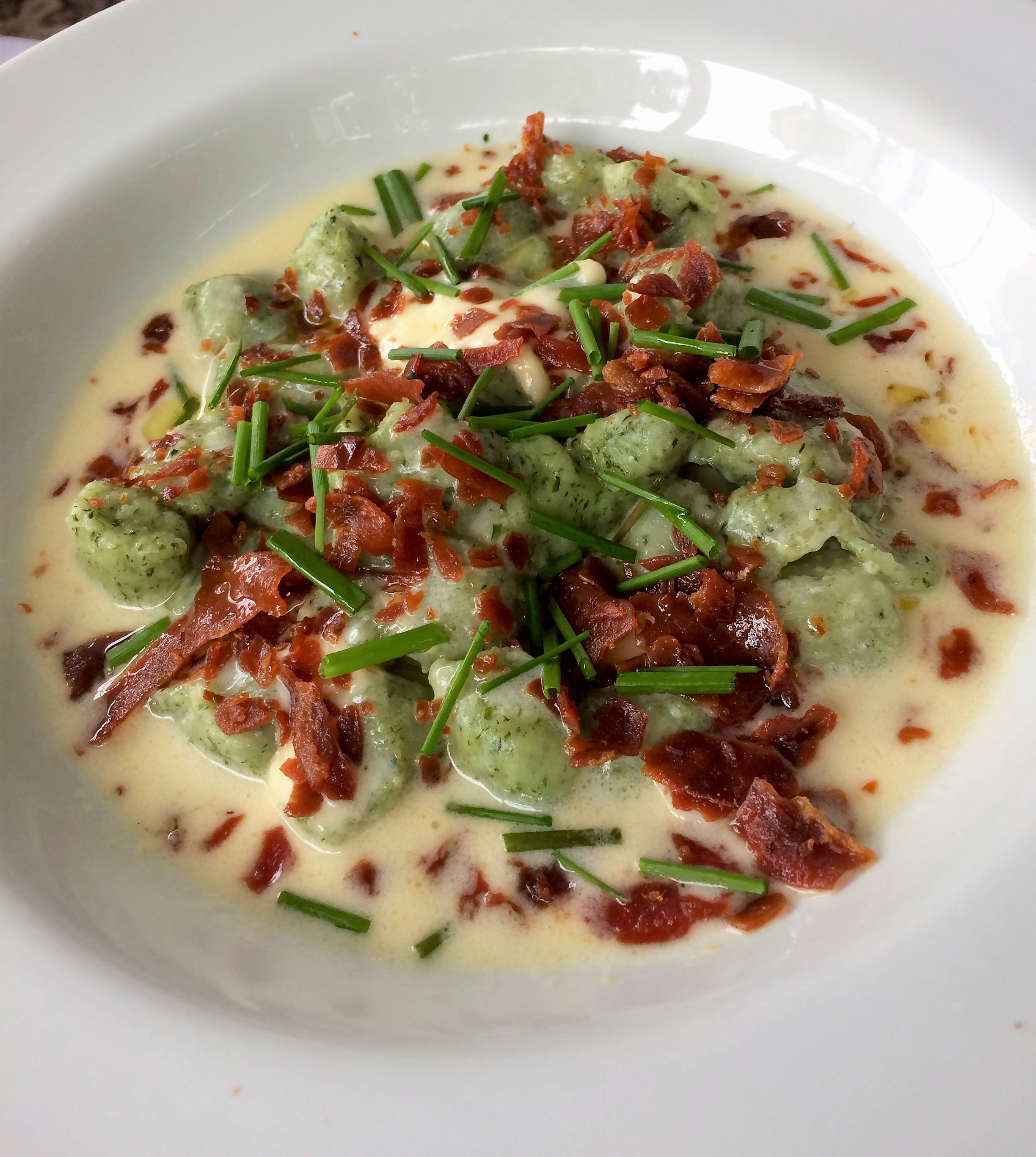 - O nhoque de espinafre com ao molho de queijo talégio e crisps de parma