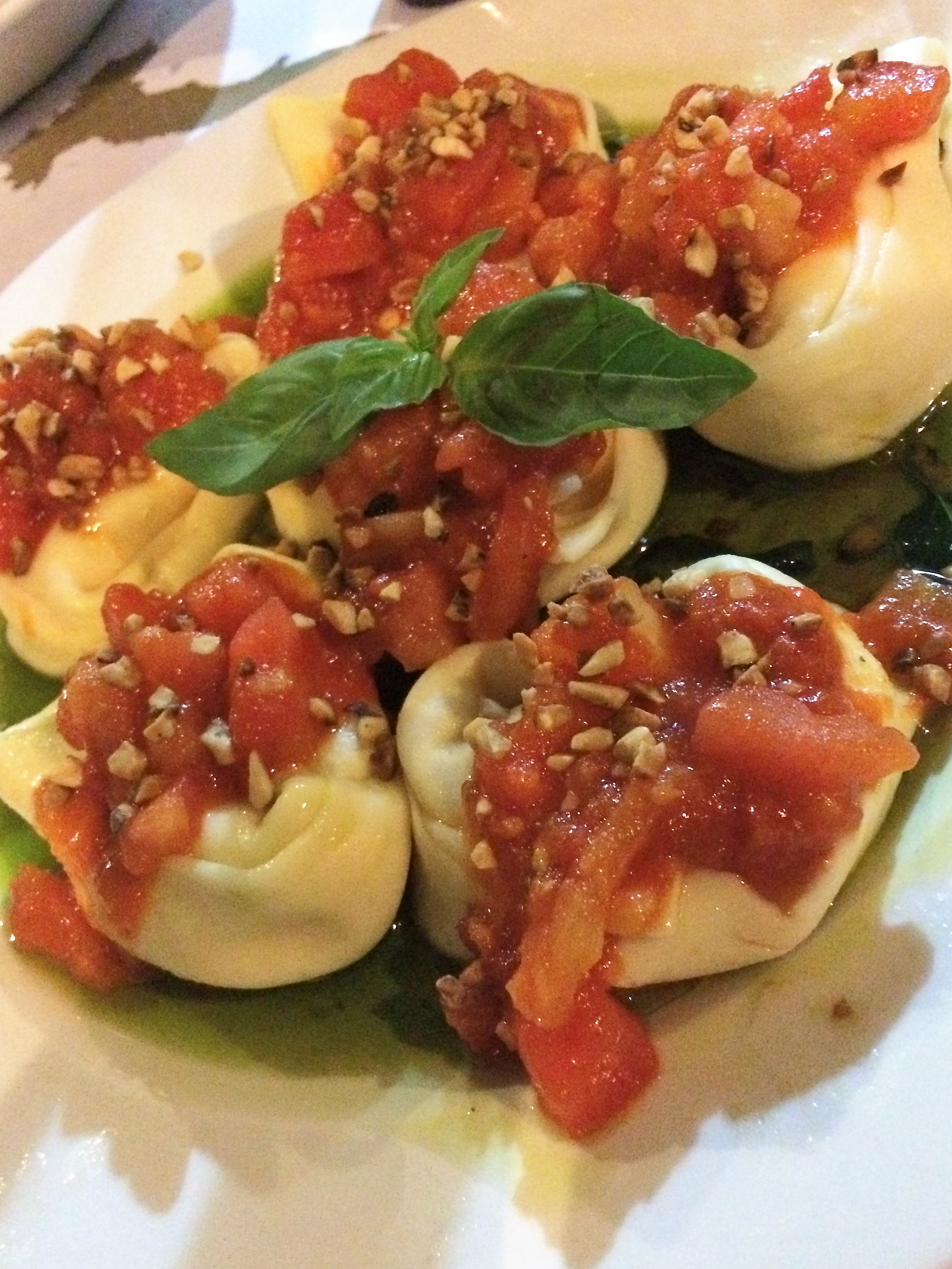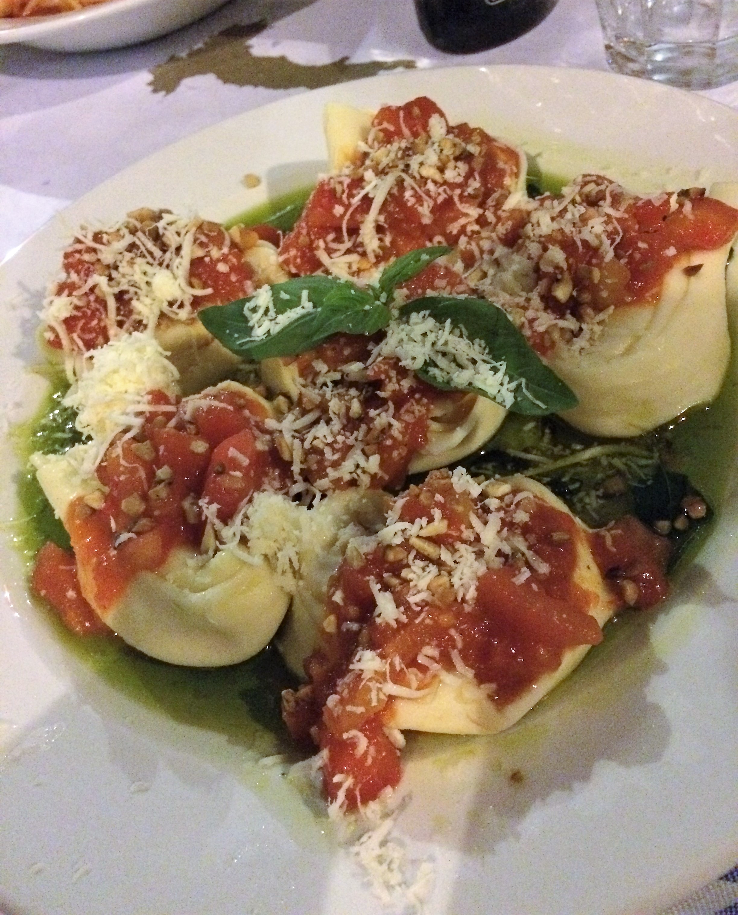 Passamos aos principais. Meus acompanhantes secretos foram de risoto de camarão e funghi, Spaghetti alla Carbonara (receita original com Pancetta), Spaguetti Fantasia di Mare (com camarões, polvo, lula e vôngole e mexilhões) e meu marido secreto pediu seu indefectível spagheti apenas com camarões e pouco molho pomodoro, que ele busca experimentar em todos os restaurantes italianos que tem oportunidade. Todos elogiadíssimos. Apostei no prato mais comentado de lá, o tortelloni Casa do Sardo. Com recheio de queijo e coberto com molho pomodoro caseiro, azeite, manjericão e castanhas. Sabe quando a gente adora tanto um prato que não quer experimentar os outros? Foi assim…
