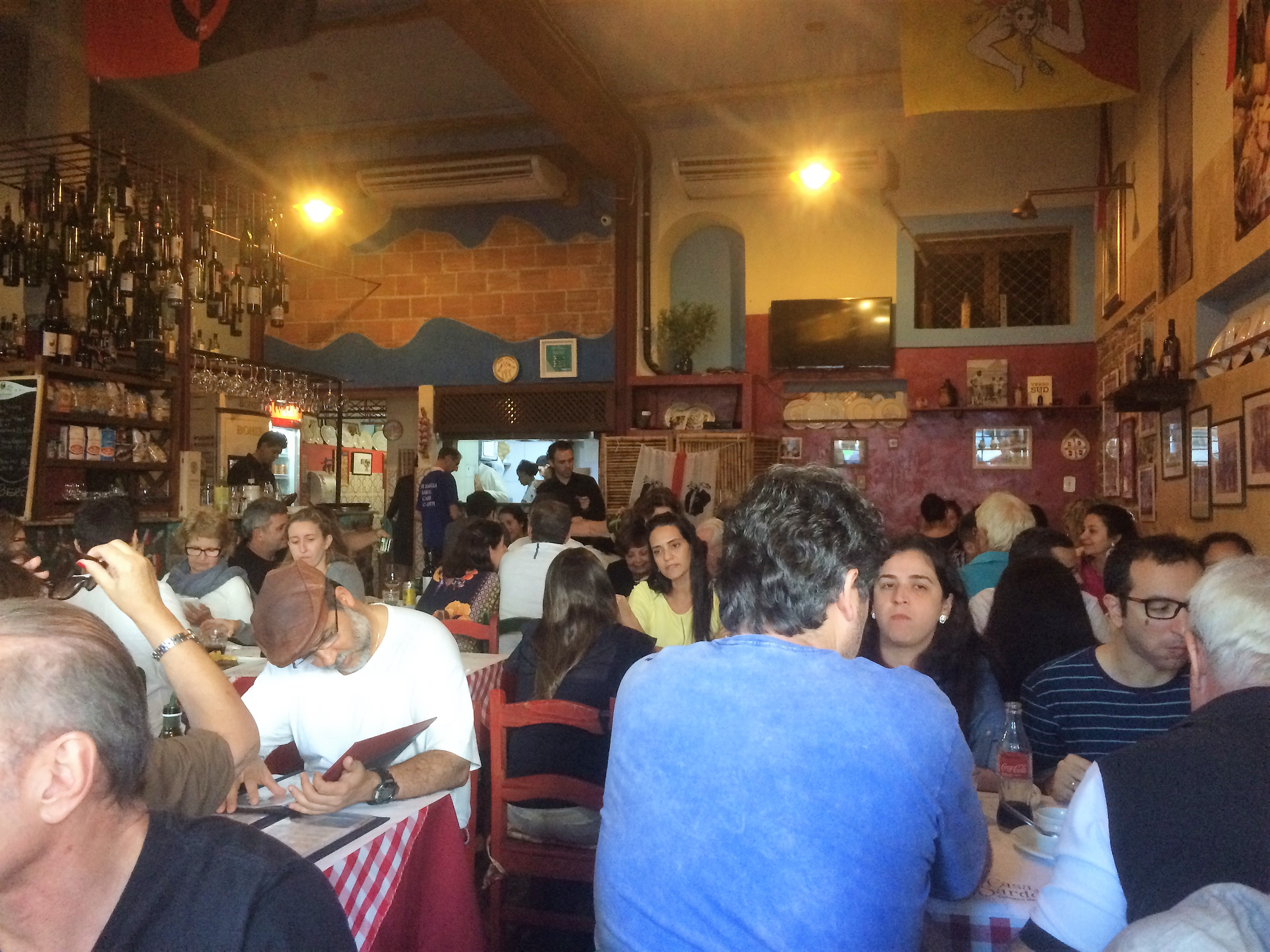 Acabamos conseguindo uma mesa ótima, colada à janela, com a vista completa do salão, lotado, num domingo. A decoração é rústica, como convém a uma cantina, e cada milímetro é ocupado por mesas. No almoço, é mesmo um lugar para conversar sem se preocupar com os altos decibéis, que se elevam ainda mais à medida que os vinhos da carta, que privilegia, logicamente, os rótulos da Sardenha, com preços também bem parceiros, descem às mesas.
