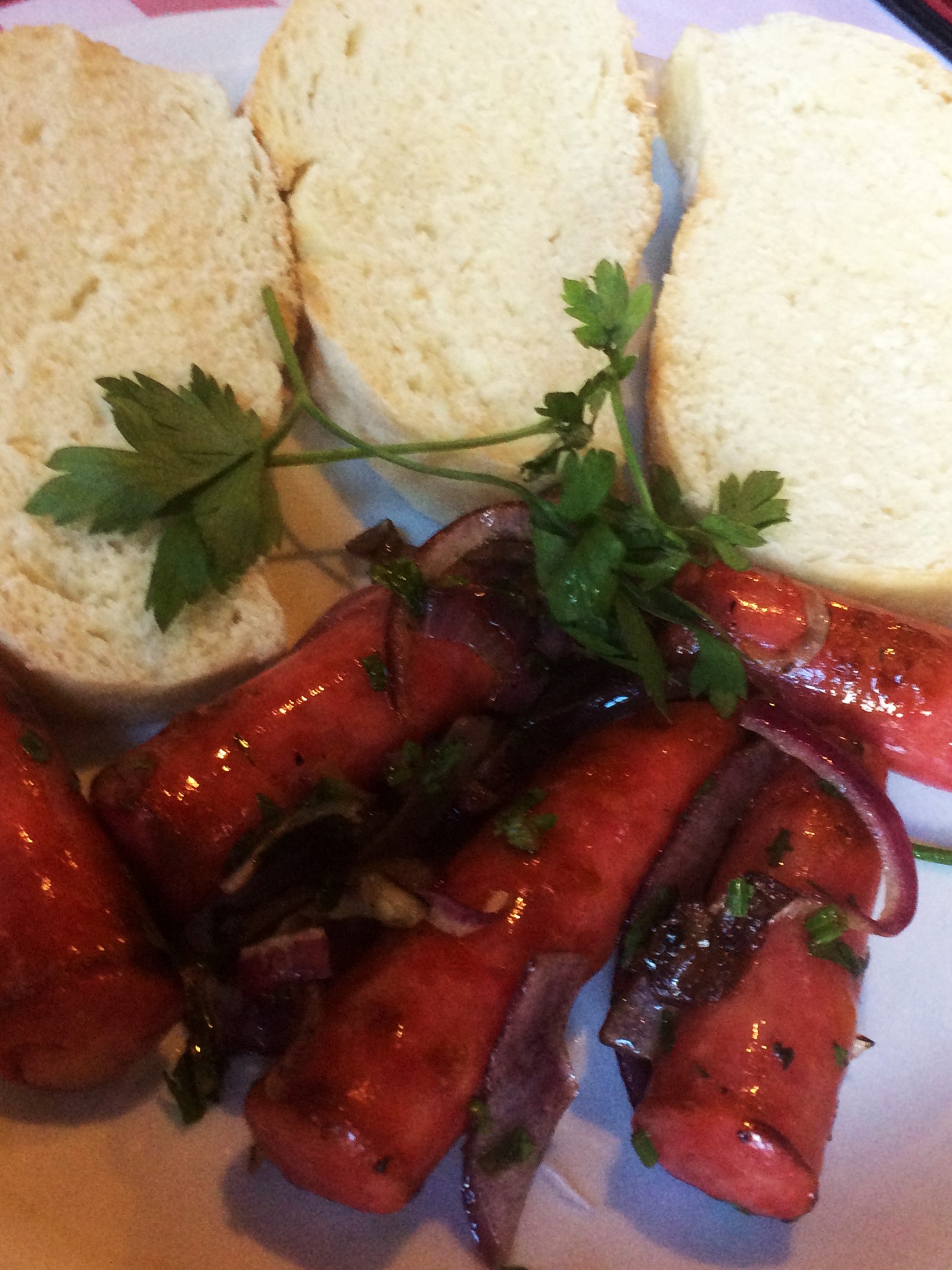 - Linguiça assada com cebolas roxas